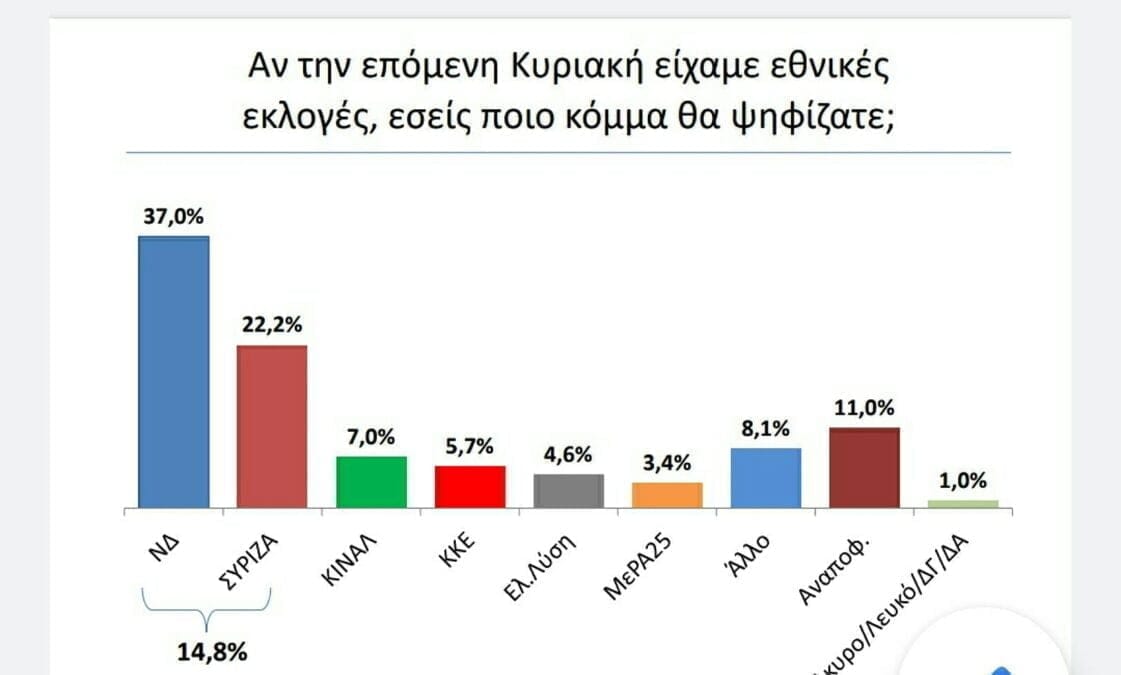 ΜΠΡΟΣΤΑ Η ΝΔ ΣΤΗΝ ΠΡΟΘΕΣΗ ΨΗΦΟΥ ΜΕ 37% ΚΑΙ ΔΙΑΦΟΡΑ 14,8% ΑΠΟ ΤΟΝ ΣΥΡΙΖΑ