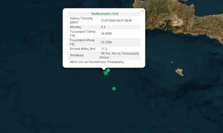 Σεισμός μεγέθους 5,3 Ρίχτερ έγινε πριν από λίγο στα Χανιά. Σύμφωνα με το Γεωδυναμικό Ινστιτούτο Αθηνών, ο σεισμός έγινε 59 χιλιόμετρα νοτιοδυτικά της Παλαιοχώρας και είχε εστιακό βάθος 17,2 χιλιόμετρα.