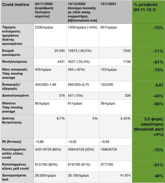Όπως φαίνεται στον παρακάτω πίνακα παρατηρείται η μεταβολή των κρίσιμων δεικτών από την κορύφωση του δευτέρου κύματος μέχρι και χτες.