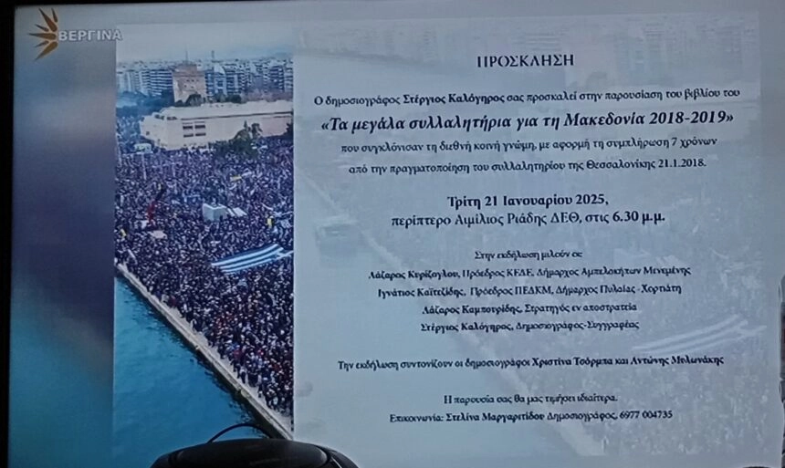 Η παρουσίαση θα γίνει την Τρίτη 21 Ιανουαρίου στις 18.30 στην αίθουσα Α. Ριαδης στην ΔΕΘ με αφορμή την συμπλήρωση 7 χρόνων από το μεγάλο συλλαλητήριο της Θεσσαλονίκης.