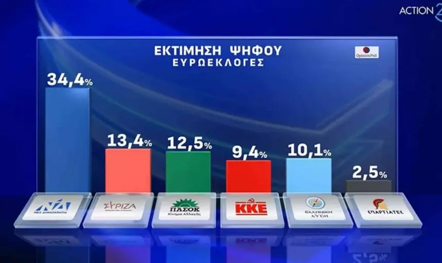 Συγκεκριμένα, σύμφωνα με τη δημοσκόπηση της Opinion Poll, στην πρόθεση ψήφου για τις ευρωεκλογές, η Νέα Δημοκρατία καταγράφει 27,7%, ενώ ο ΣΥΡΙΖΑ είναι δεύτερος με 10,8%. Ακολουθεί το ΠΑΣΟΚ με 10% και στην τέταρτη θέση η Ελληνική Λύση με 8,1%. Το ΚΚΕ βρίσκεται στο 7,6% και η Νίκη στο 3,4%. Οι Δημοκράτες στο 2,4%, η Πλεύση Ελευθερίας στο 2,4%, η Νέα Αριστερά στο 2,2% και οι Σπαρτιάτες στο 2%. Τέλος, το ΜέΡΑ25 καταγράφεται στο 1,5%.
