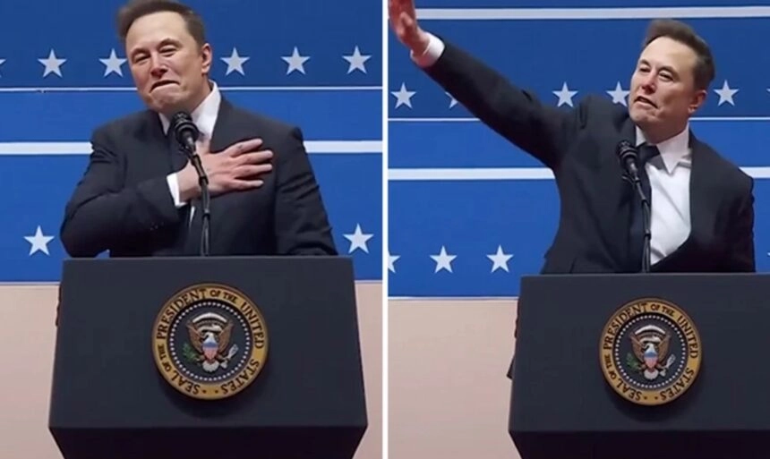 Ο Μασκ ευχαρίστησε το πλήθος που έστειλε τον Ρεπουμπλικάνο μεγιστάνα ξανά στον Λευκό Οίκο, κατόπιν άγγιξε με το δεξί του χέρι το αριστερό μέρος του στήθους του και ύψωσε το χέρι με την παλάμη ανοικτή κι εκτεταμένη. Επανέλαβε τη χειρονομία στρεφόμενος προς το υπόλοιπο πλήθος, πίσω του.