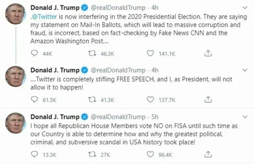 Ο ένοικος του Λευκού Οίκου κατήγγειλε με δύο νέες αναρτήσεις του στο Twitter ότι η διεύθυνση του ιστότοπου απειλεί την «ελευθερία του λόγου», κάτι που «εγώ, ως πρόεδρος, δεν θα επιτρέψω να γίνει!».