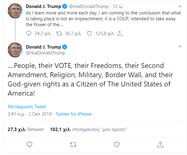 Ο Αμερικανός πρόεδρος Ντόναλντ Τράμπ χαρακτήρισε τη διαδικασία της ενδεχόμενης παραπομπής του με «πραξικόπημα», κλιμακώνοντας ακόμη περισσότερο την επίθεση που εξαπολύει τις τελευταίες ημέρες εναντίον της αντιπολίτευσης των Δημοκρατικών.