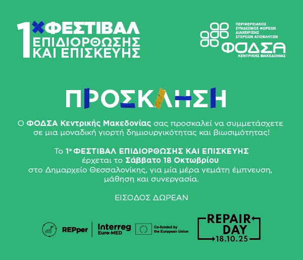 Ο ΦΟΔΣΑ Κεντρικής Μακεδονίας, στο πλαίσιο του έργου EURO MED REP.PER PERSPECTIVE και με αφορμή τη Διεθνή Ημέρα Επισκευής, σας προσκαλεί το Σάββατο 18 Οκτωβρίου 2025, από τις 10:00 έως τις 14:00, στο Δημαρχείο Θεσσαλονίκης, στο πρώτο φεστιβάλ αφιερωμένο στην επισκευή, την επιδιόρθωση και τη δημιουργικότητα.