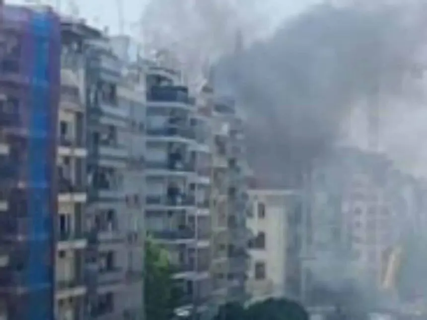 Μαύροι καπνοί βγαίνουν από το κτίριο, που βρίσκεται ακριβώς δίπλα από την πολυκατοικία που στεγάζει τα γραφεία του ΣΥΡΙΖΑ.