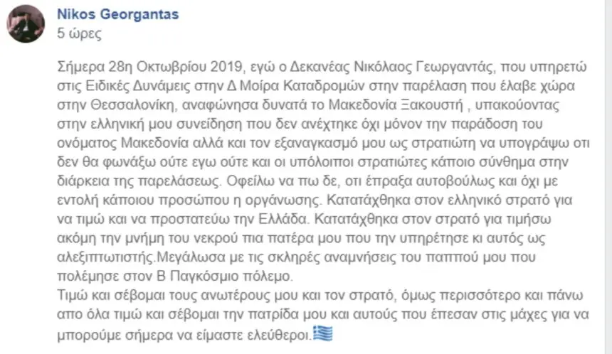 Νικος Γεωργαντάς:Σήμερα 28η Οκτωβρίου 2019, εγώ ο Δεκανέας Νικόλαος Γεωργαντάς, που υπηρετώ στις Ειδικές Δυνάμεις στην Δ Μοίρα Καταδρομών στην παρέλαση που έλαβε χώρα στην Θεσσαλονίκη, αναφώνησα δυνατά το Μακεδονία Ξακουστή , υπακούοντας στην ελληνική μου συνείδηση που δεν ανέχτηκε όχι μόνον την παράδοση του ονόματος Μακεδονία αλλά και τον εξαναγκασμό μου ως στρατιώτη να υπογράψω οτι δεν θα φωνάξω ούτε εγω ούτε και οι υπόλοιποι στρατιώτες κάποιο σύνθημα στην διάρκεια της παρελάσεως. Οφείλω να πω δε, οτι έπραξα αυτοβούλως και όχι με εντολή κάποιου προσώπου η οργάνωσης. Κατατάχθηκα στον ελληνικό στρατό για να τιμώ και να προστατεύω την Ελλάδα. Κατατάχθηκα στον στρατό για τιμήσω ακόμη την μνήμη του νεκρού πια πατέρα μου που την υπηρέτησε κι αυτός ως αλεξιπτωτιστής.Μεγάλωσα με τις σκληρές αναμνήσεις του παππού μου που πολέμησε στον Β Παγκόσμιο πόλεμο.
