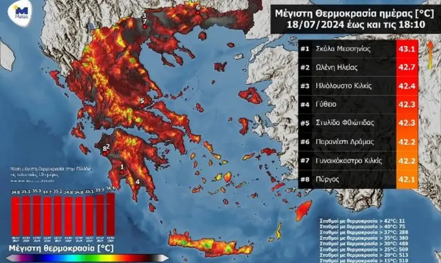 Και το Σαββατοκύριακο θα συνεχιστούν οι πολύ υψηλές θερμοκρασίες με μέγιστες τιμές πάνω από τους 40 βαθμούς Κελσίου. Σύμφωνα με την ΕΜΥ, από τις αρχές της ερχόμενης εβδομάδας θα υπάρξει μικρή υποχώρηση της θερμοκρασίας, τόσο στις μέγιστες όσο και στις ελάχιστες τιμές της στις περισσότερες περιοχές της χώρας και μόνο τοπικά, στα κεντρικά και τα νότια ηπειρωτικά θα διατηρηθεί σε υψηλά επίπεδα.