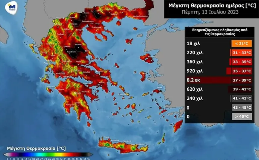 Όπως φαίνεται στο χάρτη, περίπου 8,2 εκατομμύρια άνθρωποι αναμένεται να βιώσουν θερμοκρασίες άνω των 37 °C, ενώ περίπου 620 χιλιάδες άνθρωποι θα βιώσουν θερμοκρασίες άνω των 39 °C. Σημειώνεται, ότι τα δημογραφικά στοιχεία αφορούν του μόνιμους κάτοικους κάθε περιοχής, ενώ οι οποιεσδήποτε μετακινήσεις (π.χ. λόγω θερινών διακοπών) που μεταβάλλουν πρόσκαιρα τους κατά τόπους πληθυσμούς, δεν έχουν ληφθεί υπόψη.