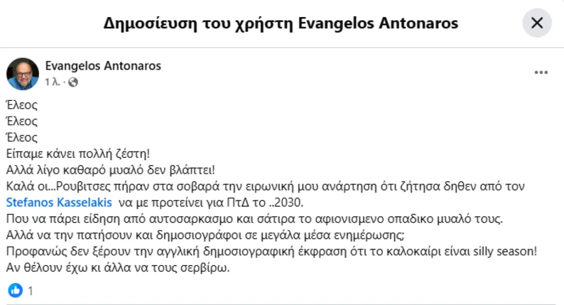 Καλά οι…Ρουβιτσες πήραν στα σοβαρά την ειρωνική μου ανάρτηση ότι ζήτησα δηθεν από τον Stefanos Kasselakis να με προτείνει για ΠτΔ το ..2030.