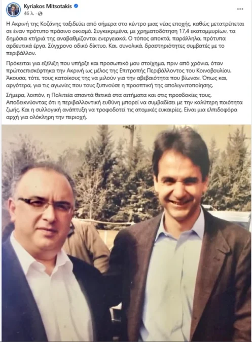 O πρωθυπουργός Κυριάκος Μητσοτάκης, σε ανάρτησή του στο Facebook, τονίζει ότι η περιβαλλοντική ευθύνη μπορεί να συνυπάρχει με καλύτερη ποιότητα ζωής, αναφέροντας ως παράδειγμα την Ακρινή Κοζάνης, που μετατρέπεται σε πρότυπο πράσινο οικισμό.