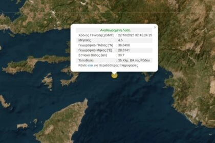 Σεισμός 4,5 Ρίχτερ ανοιχτά της Ρόδου – «Δεν υπάρχει λόγος ανησυχίας» λένε οι σεισμολόγοι