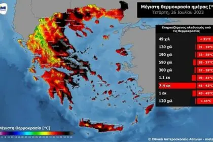 8,5 εκατομμύρια άνθρωποι στην Ελλάδα θα βιώσουν θερμοκρασίες άνω των 41 °C σήμερα