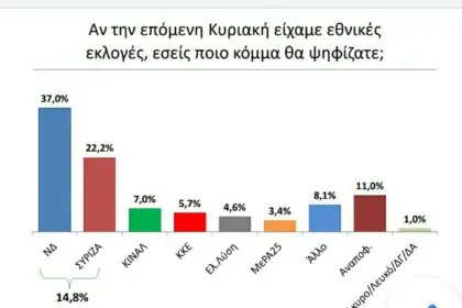 “ΣΑΡΩΝΕΙ” Η ΚΥΒΕΡΝΗΣΗ ΣΤΟ ΚΡΑΣ ΤΕΣΤ – ΜΠΡΟΣΤΑ ΜΕ 37% Η ΝΔ ΣΤΗΝ ΠΡΟΘΕΣΗ ΨΗΦΟΥ ΜΕ ΔΙΑΦΟΡΑ 14,8% ΑΠΟ ΤΟΝ ΣΥΡΙΖΑ