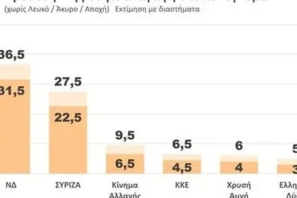 Προβάδισμα 9 μονάδων σημειώνει η Νέα Δημοκρατία έναντι του ΣΥΡΙΖΑ, στην πρόθεση ψήφου για τις…