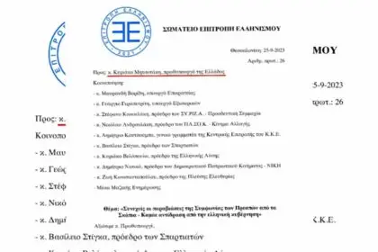 ΣΩΜΑΤΕΙΟ ΕΠΙΤΡΟΠΗ ΕΛΛΗΝΙΣΜΟΥ Θεσσαλονίκη: 25-9-2023Αριθμ. πρωτ.: 26 Προς: κ. Κυριάκο Μητσοτάκη, πρωθυπουργό της ΕλλάδοςΚοινοποίηση: Θέμα:…