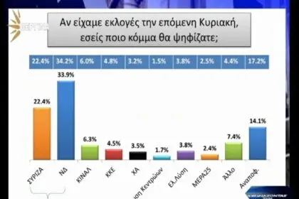 Δημοσκόπηση από την Βεργίνα τηλεόραση : ΑΥΤΟΔΥΝΑΜΗ ΝΔ με 160 ΕΔΡΕΣ & ΕΞΑΚΟΜΜΑΤΙΚΗ ΒΟΥΛΗ. Στο 11,5% η διαφορά ΝΔ-ΣΥΡΙΖΑ