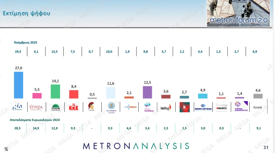 Η μέτρηση βγάζει 8κομματική Βουλή, με τη Νίκη (2,1%), τους Σπαρτιάτες (0,5%), τη Νέα Αριστερά (2,7%) και το κόμμα Κασσελάκη (1,4% από 2,7%) να μένουν καθαρά εκτός.