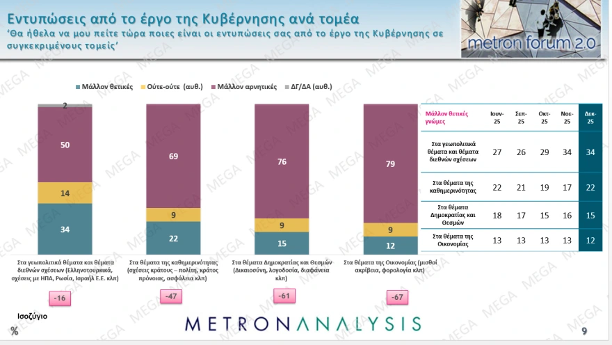 Η κυβέρνηση παίρνει 34% θετικές γνώμες στα θέματα εξωτερικής πολιτικής και στα γεωπολιτικά και 22% στα θέματα της καθημερινότητας, αλλά μόλις 15% στα θέματα δικαιοσύνης, λογοδοσίας και διαφάνειας και 12% στα θέματα οικονομίας. Παράλληλα, το 71% λέει ότι η πορεία της χώρας είναι σε λάθος κατεύθυνση, από 69% τον Νοέμβριο.