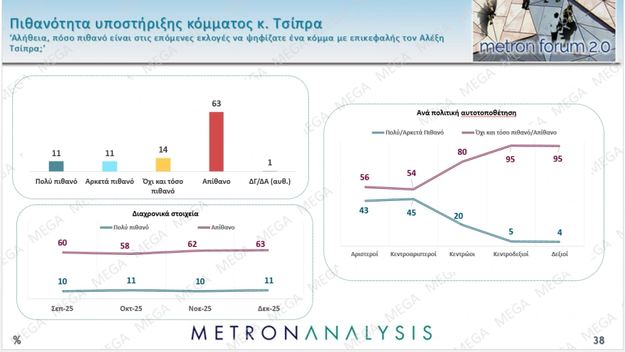 Στο 11% βρίσκει η Metron Analysis τον «πυρήνα» της δυνητικής ψήφου σε ένα κόμμα υπό τον Αλέξη Τσίπρα, μία μονάδα πάνω σε σχέση με τον Νοέμβριο. Ο πρώην πρωθυπουργός έχει σημαντική διείσδυση άνω του 50% στους αριστερούς και τους κεντροαριστερούς ψηφοφόρους, αλλά το πέρασμά του στον χώρο του Κέντρου παραμένει χαμηλό, στο 20%. Πάντως, η «περίμετρός» είναι στο 22%.