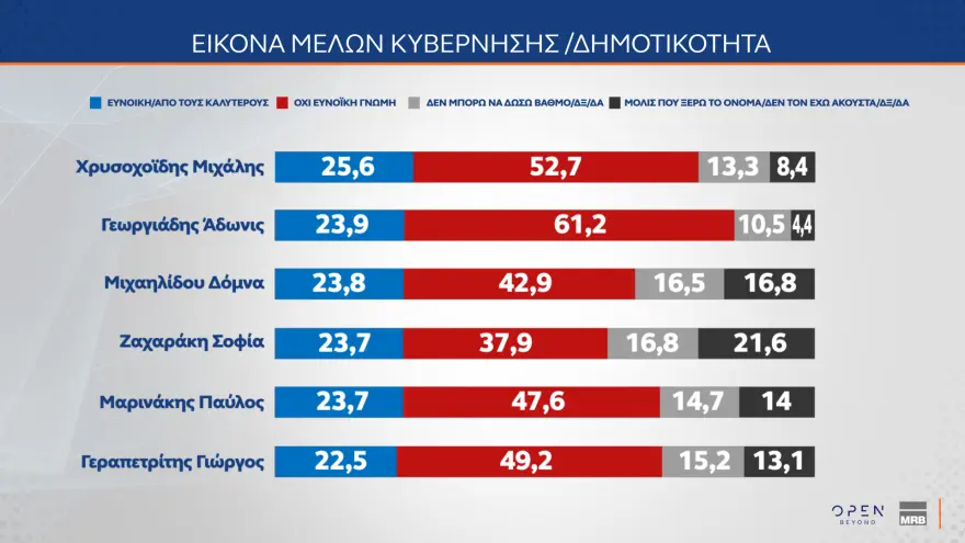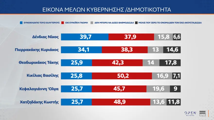 Σταθερά πρώτος σε δημοτικότητα από τα μέλη της κυβέρνησης παραμένει ο υπουργός Εθνικής Άμυνας, Νίκος Δένδιας, ενώ τη χειρότερη γνώμη έχουν οι πολίτες για τον Άδωνι Γεωργιάδη με 61,2%.
