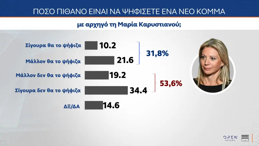 Σχετικά με την Μαρία Καρυστιανού, το 15,6% δήλωσε πως θα ψήφιζε ένα πιθανό κόμμα με εκείνη αρχηγό ενώ δεν θα το ψήφιζε το 53,6%.