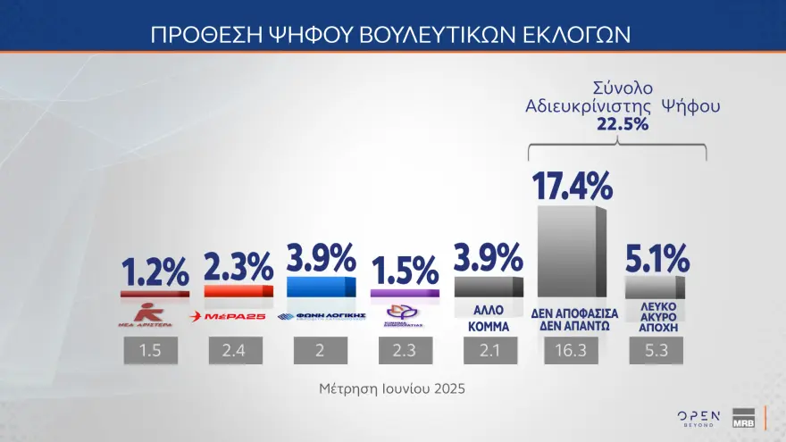 Στο 11,5% διαμορφώνεται η διαφορά μεταξύ ΝΔ και ΠΑΣΟΚ στην Πρόθεση Ψήφου, σύμφωνα με τη νέα δημοσκόπηση MRB για OPEN. Το κυβερνών κόμμα παραμένει πρώτο με 22,6%, ενώ στην τρίτη θέση ανεβαίνει η Ελληνική Λύση με 7,5%.