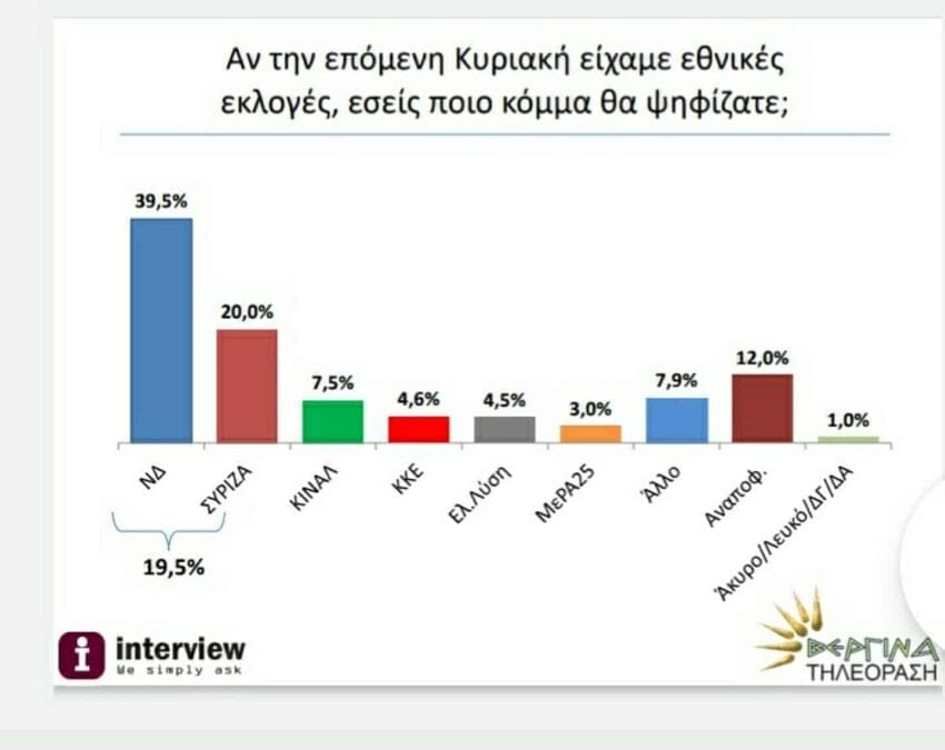 DOUBLE SCORE ΜΗΤΣΟΤΑΚΗ ΣΤΗΝ ΠΡΟΘΕΣΗ ΨΗΦΟΥ-Η ΝΔ ΠΡΟΗΓΕΙΤΑΙ ΤΟΥ ΣΥΡΙΖΑ ΜΕ 19,5 ΜΟΝΑΔΕΣ ΠΑΝΕΛΛΑΔΙΚΗ ΔΗΜΟΣΚΟΠΗΣΗ ΤΗΣ ΒΕΡΓΙΝΑ TV