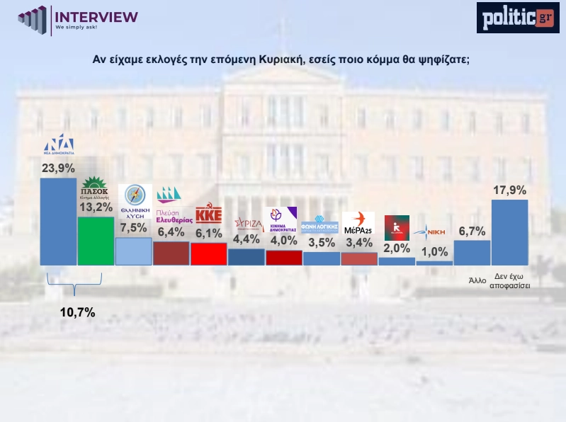 Interview: Ισχυρό προβάδισμα ΝΔ με 29,7% – Στο 15% το ΠΑΣΟΚ