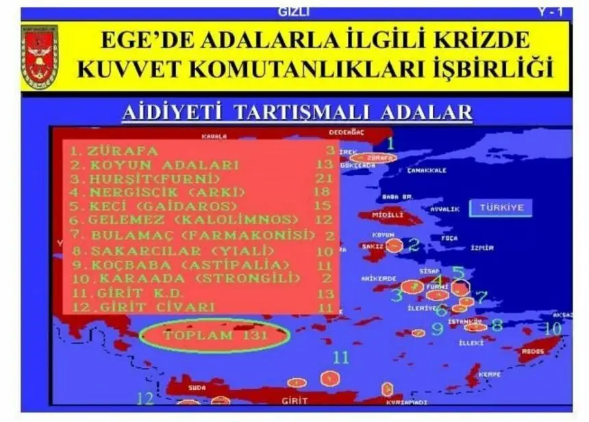 Σύμφωνα με το δημοσίευμα οι Ενοπλες Δυνάμεις της Τουρκίας είχαν σχέδιο για την κατάληψη ελληνικών νησιών και νησίδων στο Αιγαίο Πέλαγος, συγκεκριμένα πρόκειται για 131 περιπτώσεις νησιών και νησίδων που η Τουρκία επιχειρεί να «γκριζάρει» τα τελευταία χρόνια. Σύμφωνα με το δημοσίευμα, τα νησιά, οι νησίδες και οι βραχονησίδες που «γκριζάρουν» οι Τούρκοι είναι τα εξής: