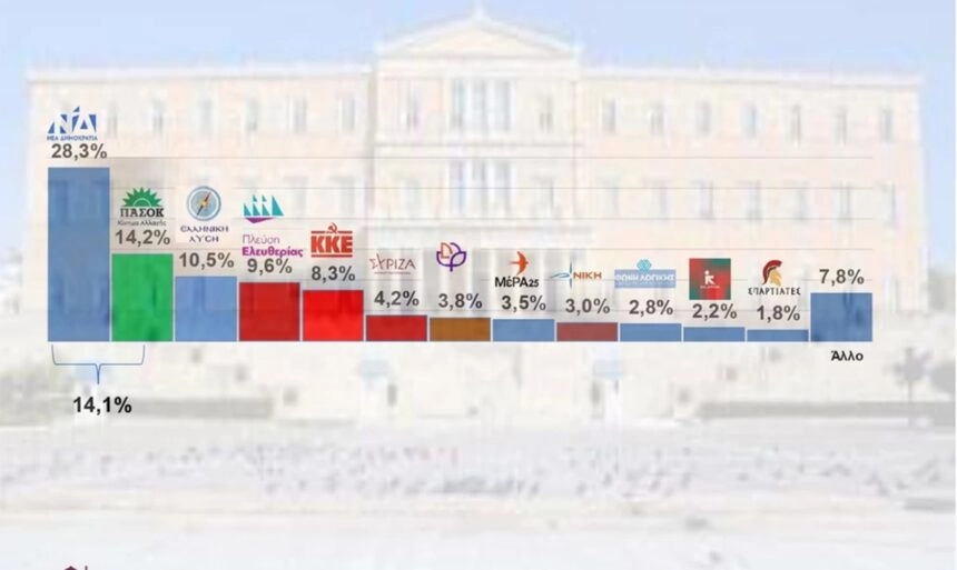 Νέα δημοσκόπηση: Στο 28,3% η ΝΔ, δεύτερο το ΠΑΣΟΚ, τέταρτη η Πλεύση Ελευθερίας – «Όχι» σε νέο κόμμα Σαμαρά και Τσίπρα