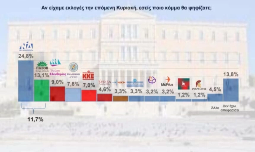 Στο ερώτημα εάν οι εκλογές γίνονταν την ερχόμενη Κυριακή, η Νέα Δημοκρατία συγκεντρώνει 24,8%, το ΠΑΣΟΚ 13,1% και η Πλεύση Ελευθερίας 9%. Τα υπόλοιπα κόμματα κινούνται σε σταθερά ποσοστά χωρίς δυναμική…