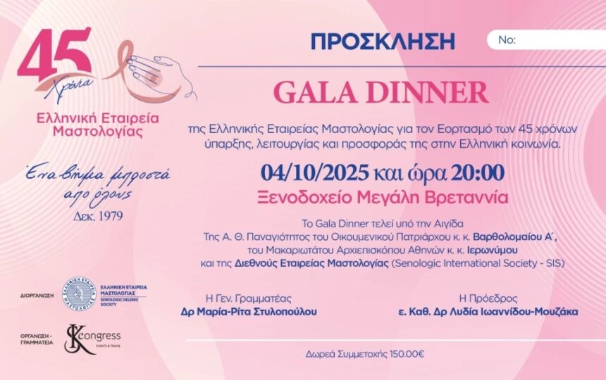 Με ιδιαίτερη χαρά και υπερηφάνεια, η Ελληνική Εταιρεία Μαστολογίας (ΕΕΜ) ανακοινώνει τη διοργάνωση της επετειακής εκδήλωσης Gala Dinner, το Σάββατο 4 Οκτωβρίου 2025, στο εμβληματικό ξενοδοχείο Μεγάλη Βρετανία στο Σύνταγμα, με αφορμή τη συμπλήρωση 45 χρόνων αδιάλειπτης επιστημονικής…