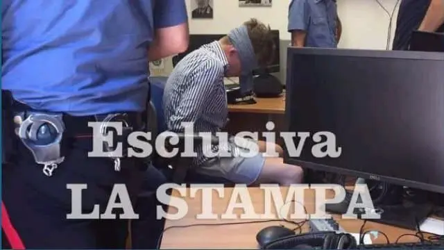 Η ιταλική εφημερίδα La Stampa δημοσίευσε χθες το βράδυ στην ηλεκτρονική της έκδοση μια αποκλειστική φωτογραφία του Αμερικανού Έλντερ Φίνεγκαν Λι, που κατηγορείται ότι ήταν εκείνος που μαχαίρωσε τουλάχιστον οκτώ φορές το θύμα, τον αστυνομικό Μάριο Ρέγκα Τσερτσιέλο και προκάλεσε έτσι το θάνατό του. Στην φωτογραφία φαίνεται ο 19χρονος Αμερικανός δεμένος πισθάγκωνα με χειροπέδες και με τα μάτια του δεμένα, με ένα μαντήλι! Κάθεται σκυφτός σε μια καρέκλα ανάμεσα στα γραφεία του αστυνομικού τμήματος όπου κρατείται, ενώ γύρω του διακρίνονται αστυνομικοί που συνεχίζουν την δουλειά τους.