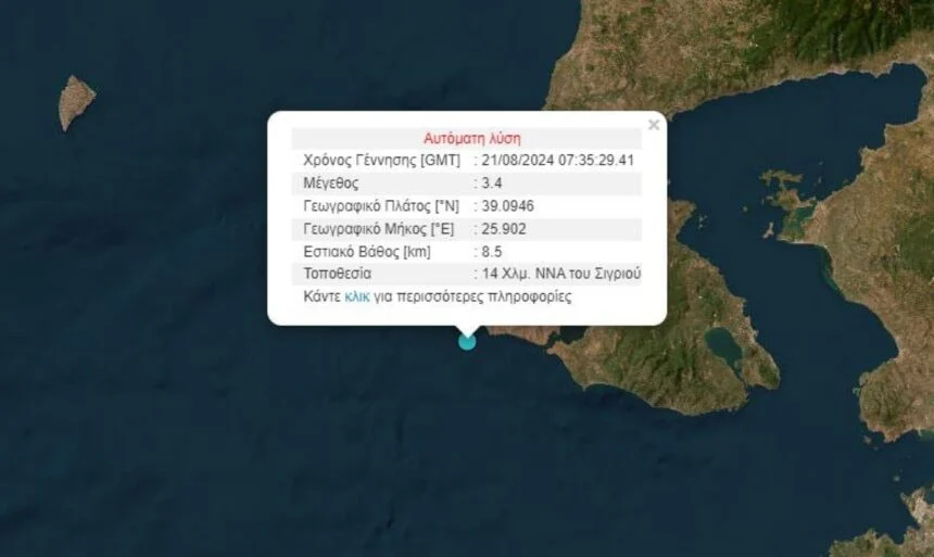 Σεισμός έγινε πριν από λίγο στην Λέσβο. Ο σεισμός σύμφωνα με την αυτόματη λύση του Γεωδυναμικού Ινστιτούτου είχε μέγεθος 3,4 Ρίχτερ και έγινε 14 χιλιόμετρα ΝΝΑ του Σιγριού.