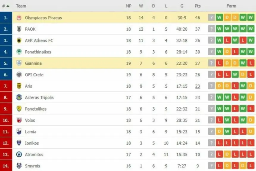 Βαθμολογία Super League: Ο Ολυμπιακός πανηγύρισε την πρώτη του νίκη στο 2022 και τα χαμόγελα επέστρεψαν στους ερυθρόλευκους. Οι παίκτες του Πέδρο Μαρτίνς επικράτησαν 2-0 του ΠΑΣ Γιάννινα για την 19η αγωνιστική της Super League Interwetten.Νωρίτερα, ο ΠΑΟΚ πήρε το διπλό στο Πανθεσσαλικό επικρατώντας 4-0 του Βόλου για την 19η αγωνιστική της Super League Interwetten. Η ΑΕΚ φιλοξενήθηκε από τον Ατρόμητο, τον οποίο νίκησε 2-0, ενώ ο Άρης και η Λαμία στο Βικελίδης έμειναν στο 0-0.