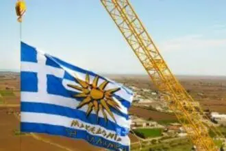 Μια ελληνική σημαία με το σήμα της Βεργίνας δεσπόζει στον ουρανό της Πέλλας. Μια επιχείρηση με βαρέως τύπου…
