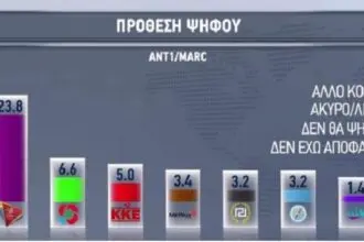 Προβάδισμα 10,5 ποσοστιαίων μονάδων για τη ΝΔ- και μάλιστα με αυτοδυναμία- δίνει δημοσκόπηση της εταιρείας Marc για λογαριασμό…