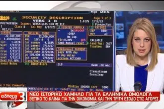 Σε ιστορικά χαμηλά επίπεδα πλησίαζαν οι αποδόσεις των ελληνικών κρατικών ομολόγων σήμερα. Η απόδοση των 10ετούς ελληνικού ομολόγου…