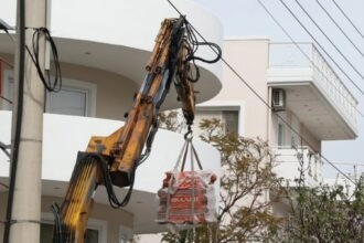 Σύμφωνα με την ΕΛ.ΑΣ., γερανοφόρο όχημα που ξεφόρτωνε οικοδομικά υλικά σε πολυκατοικία, που χτίζεται στην οδό Ερμού, φαίνεται…