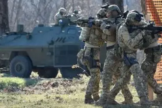 Δεκάδες στρατιώτες του ΝΑΤΟ φρουρούν σήμερα ένα δημοτικό κτίριο στην πόλη Ζβέτσαν του Κοσόβου, όπου χθες, Δευτέρα, 30…