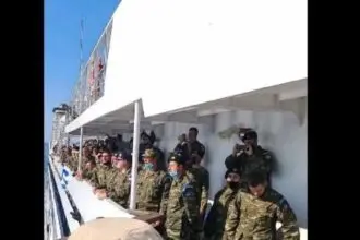 Οι νέοι στρατιώτες ψάλουν περήφανα τον Εθνικό Ύμνο, επάνω στο κατάστρωμα του πλοίου που τους μεταφέρει στο Καστελόριζο,…