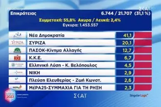 Η Νέα Δημοκρατία συγκεντρώνει 41,1% ενώ ο ΣΥΡΙΖΑ μόλις 20,1%, το ΠΑΣΟΚ είναι στο 12,7%, το ΚΚΕ στο…
