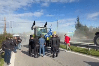 Η παλιά εθνική οδός Λάρισας–Βόλου έμεινε κλειστή στον Πλατύκαμπο, καθώς οι αγρότες παρέταξαν τα τρακτέρ τους και δημιούργησαν…