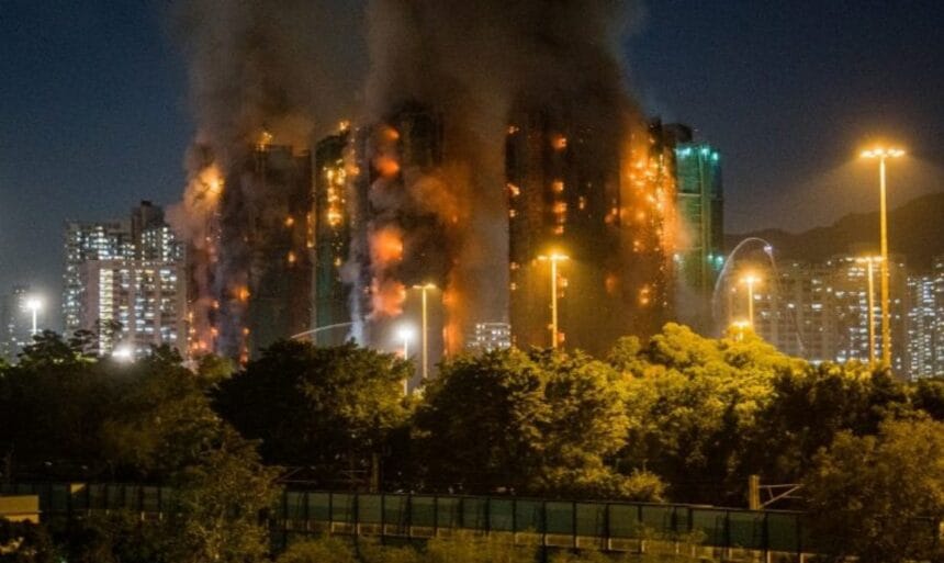 Περισσότερο από 10 ώρες μετά την έναρξη της πυρκαγιάς στη βόρεια περιοχή Τάι Πο, φλόγες και πυκνός καπνός εξακολουθούν να τυλίγουν τους πύργους με τους 32 ορόφους, καθώς οι διασώστες έχουν κατακλύσει το σημείο και οι σοκαρισμένοι κάτοικοι παρακολουθούν κοντά.